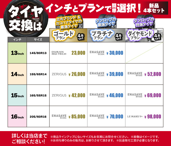 当店では、地域最安値帯の価格でタイヤ交換・取付を実施しています。